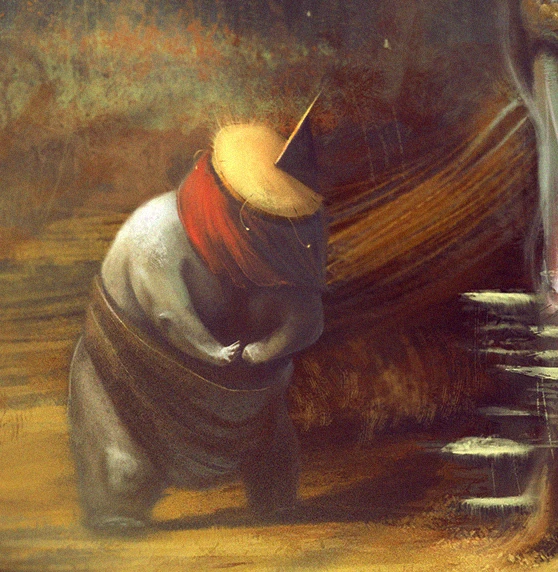 Szedł tak jakiś czas, ślepo brnąc wzdłuż linii brzegu. Brodząc po kolana w wodzie mijał krągłe istoty o szarym zabarwieniu skóry. Był jedną z nich... Niewysoką, korpulentną postacią z chustą zwieńczoną zegarem słonecznym w miejscu głowy. Czuł się jednak inny