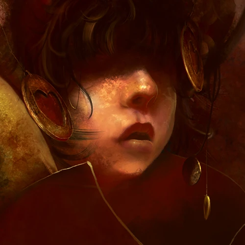 „Odziany w szkarłat czerwonooki chłopiec któremu, spod ubrań wystawały poskręcane korzenie. Kędzierzawa czupryna wzbogacona była dziecięcymi twarzami, które mozolnie rozglądały się, to w lewo, to w prawo. Obrośnięty korzeniami spoczywał na swym tronie którego stał się częścią.”